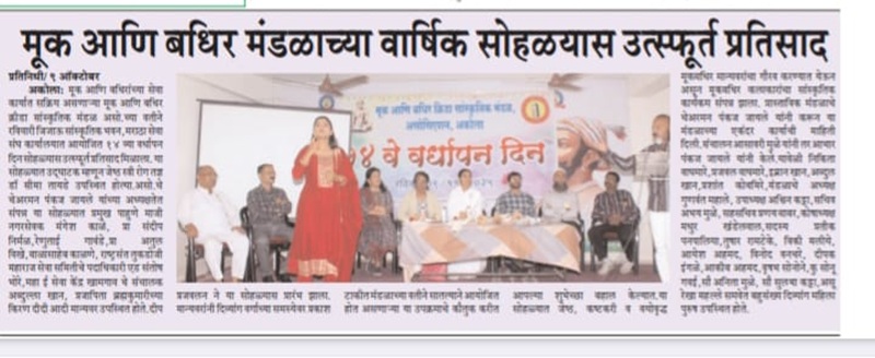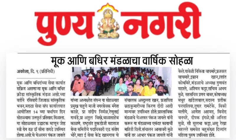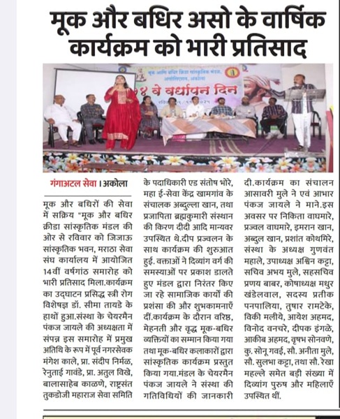 मूक और बधिरों की सेवा में सक्रिय “मूक और बधिर क्रीडा सांस्कृतिक मंडल की ओर से रविवार को जिजाऊ सांस्कृतिक भवन, मराठा सेवा संघ कार्यालय में आयोजित 14वीं वर्षगांठ समारोह को भारी प्रतिसाद मिला. कार्यक्रम का उद्घाटन प्रसिद्ध स्त्री रोग विशेषज्ञ डॉ. सीमा तायडे के हाथों हुआ. संस्था के चेयरमैन पंकज जायले की अध्यक्षता में संपन्न इस समारोह में प्रमुख अतिथि के रूप में पूर्व नगरसेवक मंगेश काले, प्रा. संदीप निर्मळ, रेनुताई गावंडे, प्रा. अतुल विखे, बालासाहेब काळणे, राष्ट्रसंत तुकडोजी महाराज सेवा समिति