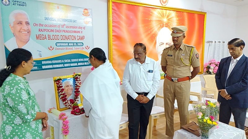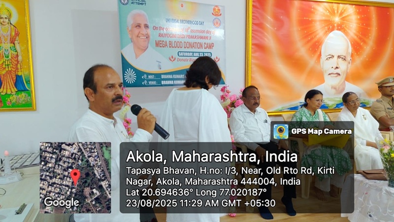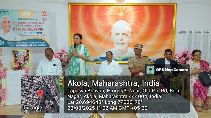प्रजापिता ब्रम्हाकुमारीज अकोला की ओर से दादी . प्रकाशमणीजी की स्मृति में कीर्ति नगर स्थित सेवा केंद्र में आयोजित रक्तदान शिविर में 127 रक्तदाताओं ने रक्तदान किया। इस शिविर के उद्घाटन कार्यक्रम में प्रमुख अतिथि के रूप में स्वास्थ्य विभाग की सहायक संचालिका डा. आरती कुलवाल, पुलिस ट्रैनिंग सेंटर के प्राचार्य डॉ. निलेश पांडे जी. एम. सी. अकोला के पैथोलॉजी विभाग प्रमुख डॉ. दिलीप सराटे तथा शिवाजी इंजीनियरिंग महाविद्यालय के प्राचार्य डॉ. प्रशांत थोरात , जीएमसी की प्राध्यापिका डा. सुवर्णा पाटिल आदि की उपस्थिति थीI मान्यवरो का स्वागत बी. के. वर्षा दीदी ने किया और ईश्वरीय सौगात बी. के. वैशाली दीदी ने दी। इस कार्यक्रम की अध्यक्षता रामदास पेठ सेवा केंद्र की संचालिका राजयोगिनी सुमन दीदी ने की I अपने अध्यक्षीय भाषण में बी.के. सुमन दीदी ने ब्रम्हाकुमारीज अपने विभिन्न प्रभागो द्वारा समाज के विभिन्न वर्गों की सेवा कर रही है, ऐसा प्रतिपादन किया I इस अवसर , पर रक्तदान का महत्व मान्यवरों ने समझाया। कार्यक्रम संचालन किरण दीदी और आभार प्रदर्शन सागर भाई ने किया। शिविर को सफल बनाने के लिए सेवाकेंद्र के ब्रम्हाकुमार- कुमारी भाई बहनों के साथ जीएमसी, पैथालॉजी विभाग की डा. सुवर्णा पाटिल, डा. राजवर्धन वानखडे, डा. शिल्पा तायडे ने अपने स्टाफ के साथ सेवा प्रदान की।