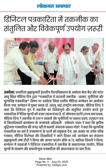 प्रजापिता ब्रह्माकुमारी ईश्वरीय विश्वविद्यालय के अकोला सेवा केंद्र और माउंट आबू स्थित मीडिया विंग द्वारा “पत्रकारिता में बदलती तकनीक अवसर, चुनौतियां और मूल्यनिष्ठ पत्रकारिता” विषय पर अकोला जिला स्तरीय मीडिया सम्मेलन का आयोजन १ अगस्त २०२५ को कियागया. सम्मेलन में मुख्य वक्ता डॉ. शांतनु भाई (राष्ट्रीय समन्वयक, मीडिया विंग) ने कहा कि डिजिटल युग में तकनीक का विवेकपूर्ण और संतुलित उपयोग करते हुए पत्रकारिता में नैतिक मूल्यों को बनाए रखना संभव है. डॉ. सोमनाथ वडनेरे (राज्य समन्वयक, मीडिया विंग) ने तकनीक से उत्पन्न अवसरों और चुनौतियों पर प्रकाश डाला. उद्घाटन सत्र में जिलाधिकारी कार्यालय के जनसंपर्क अधिकारी हर्षवर्धन पवार ने कहा कि कृत्रिम बुद्धिमत्ता पत्रकारिता की जगह नहीं ले सकती. संपादक प्रकाश पोहरे ने कहा कि मूल्यनिष्ठ पत्रकारिता का अर्थ है जनसामान्य के प्रश्नों को प्रमुखता देना. इस अवसर पर अनेक वरिष्ठ पत्रकार, मीडिया विशेषज्ञ और शिक्षाविदों ने अपने विचार रखे कार्यक्रम का संचालन ब्रह्माकुमारी वर्षा दीदी ने किया और आभार प्रदर्शन वीके अॅड. सारिका तिवारी ने किया. सम्मेलन में वक्ताओं ने डिजिटल पत्रकारिता में तकनीक के सकारात्मक उपयोग, नैतिक मूल्यों के संरक्षण और समाजोन्मुख पत्रकारिता की आवश्यकता पर बल दिया.