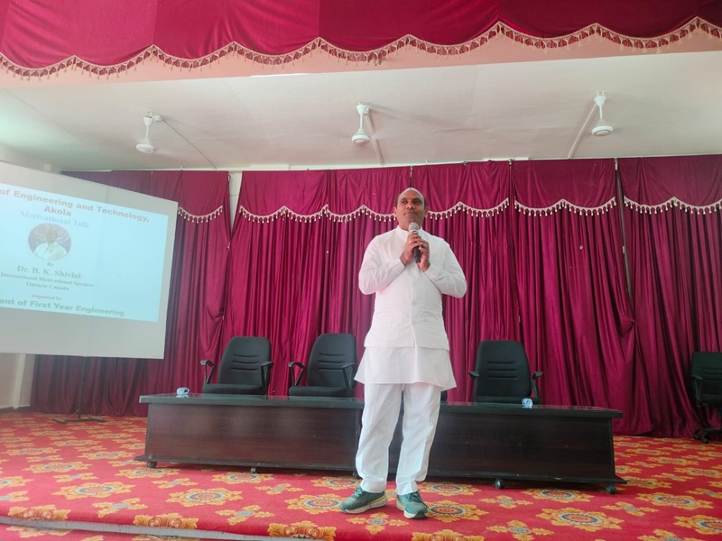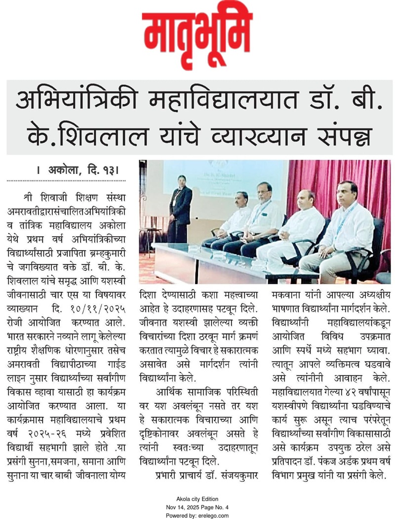श्री शिवाजी एजुकेशन सोसायटी अमरावती द्वारा संचालित बाबभूलगाव स्थित अभियांत्रिकी व तकनीकी महाविद्यालय में आयोजित कार्यक्रम में कैनेडा से अपनी यात्रा पर आए हुऐ राजयोगी डॉ. शिवलाल ने छात्राओं का उद्बोधन किया। कार्यक्रम की शुरुवात स्वर्गीय डॉ . पंजाबराव देशमुख जिन्होंने संपूर्ण विदर्भ में शिक्षा की नींव रखी उनके प्रतिमा को मान्यवरों द्वारा पुष्पांजलि अर्पण की गई। डॉ. एस. के. मकवाना, हेड ऑफ डिपार्टमेंट, मैकेनिकल इंजीनियरिंग तथा इंचार्ज प्राचार्य ने बी के शिवलाल भाई का स्वागत और सत्कार किया। इस कार्यक्रम के लिये डॉ. पंकज अर्डक , डॉ. ज्योति शेगोकार , डॉ. देवयानी राउत, प्रा. आनंद बिहाडे, प्रा. निंगवाल, डॉ. प्रेमसागर भानावत, और अभियांत्रिकी के विविध शाखाओं के छात्र उपस्थित थे। डॉ. शिवलाल जो माउन्ट आबू स्थित प्रजापिता ब्रह्मा कुमारी ईश्वरीय विश्व विद्यालय से जुड़े है और प्रेरक वक्ता है उन्होंने छात्राओं को जीवन में सफलता पाने के लिये सफलता के चार सूत्र , सुनना , समजना, समाना और सुनाना समझाए और छात्रों को मार्गदर्शन किया। इस कार्यक्रम के आयोजन के लिये प्रा. शारदा देशमुख ( स्टूडेंट्स एक्टिविटी इंचार्ज ) विशेष योगदान दिया। कार्यक्रम का संचलन पुष्कर पानसे और सुरभि लहरिया इन विद्यार्थीयो ने किया और प्रा. शारदा देशमुख ने सभी मान्यवरों के आभार व्यक्त किए।