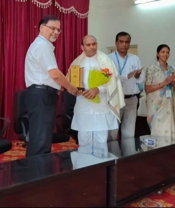 - बीके शिवलाल को संम्मान चिन्ह तथा सत्कार करते हुये प्रभारी प्राचार्य डॉ. संजय मकवाना
